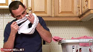 Thinking he's alone, Danny reacts exactly as I knew he would. Unable to resist the lure of the female scent, he immediately sniffs the lacy panties, inhaling deeply as he fondles his growing hard-on through his trousers. But the dumb straight man is even more of a pervert than I thought - he tiptoes upstairs to the girl's bedroom, and begins rummaging in the drawer for even more underwear! Lurking in the doorway, I watch the dirty bastard sniffing all the knickers he can find.